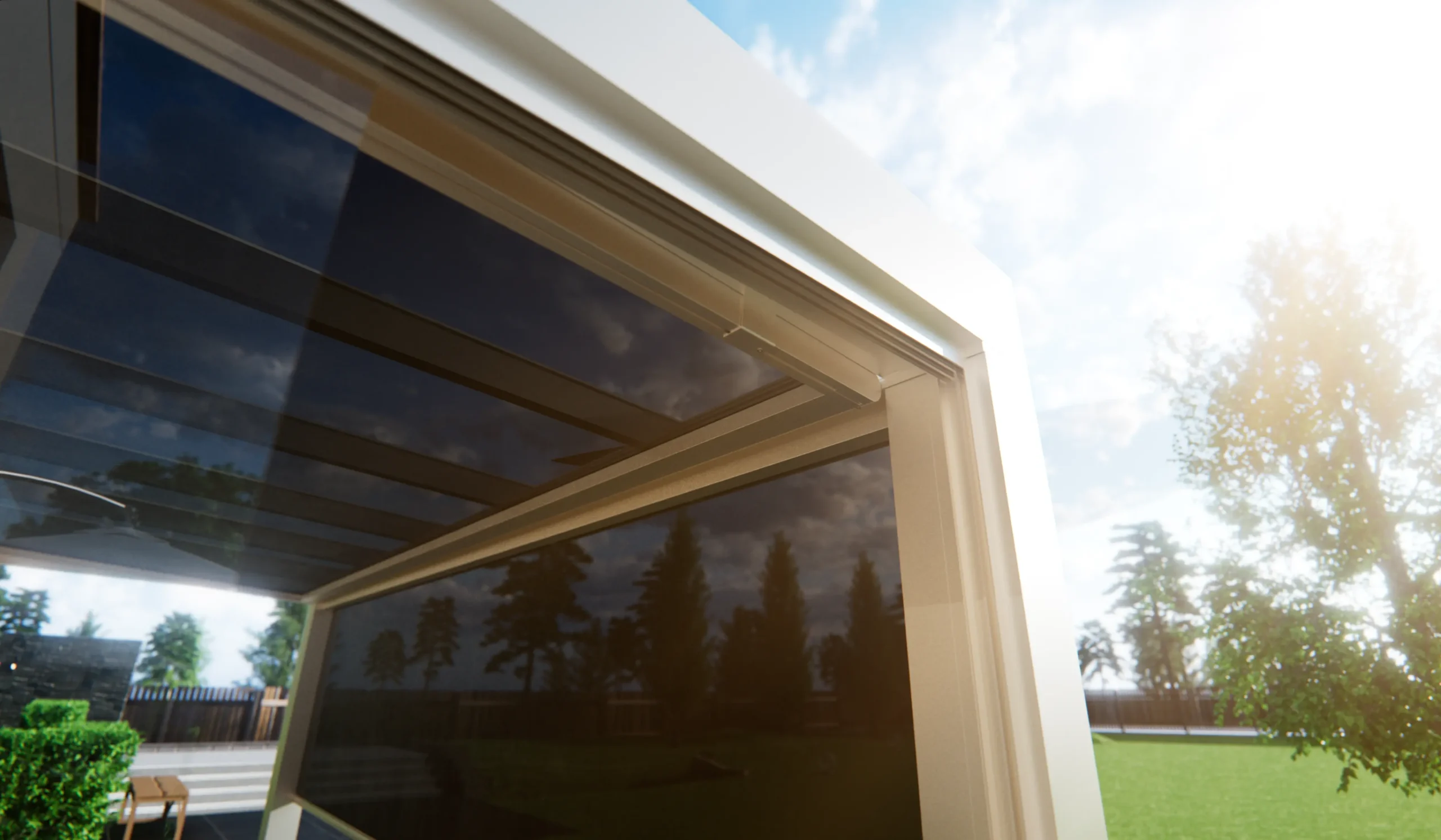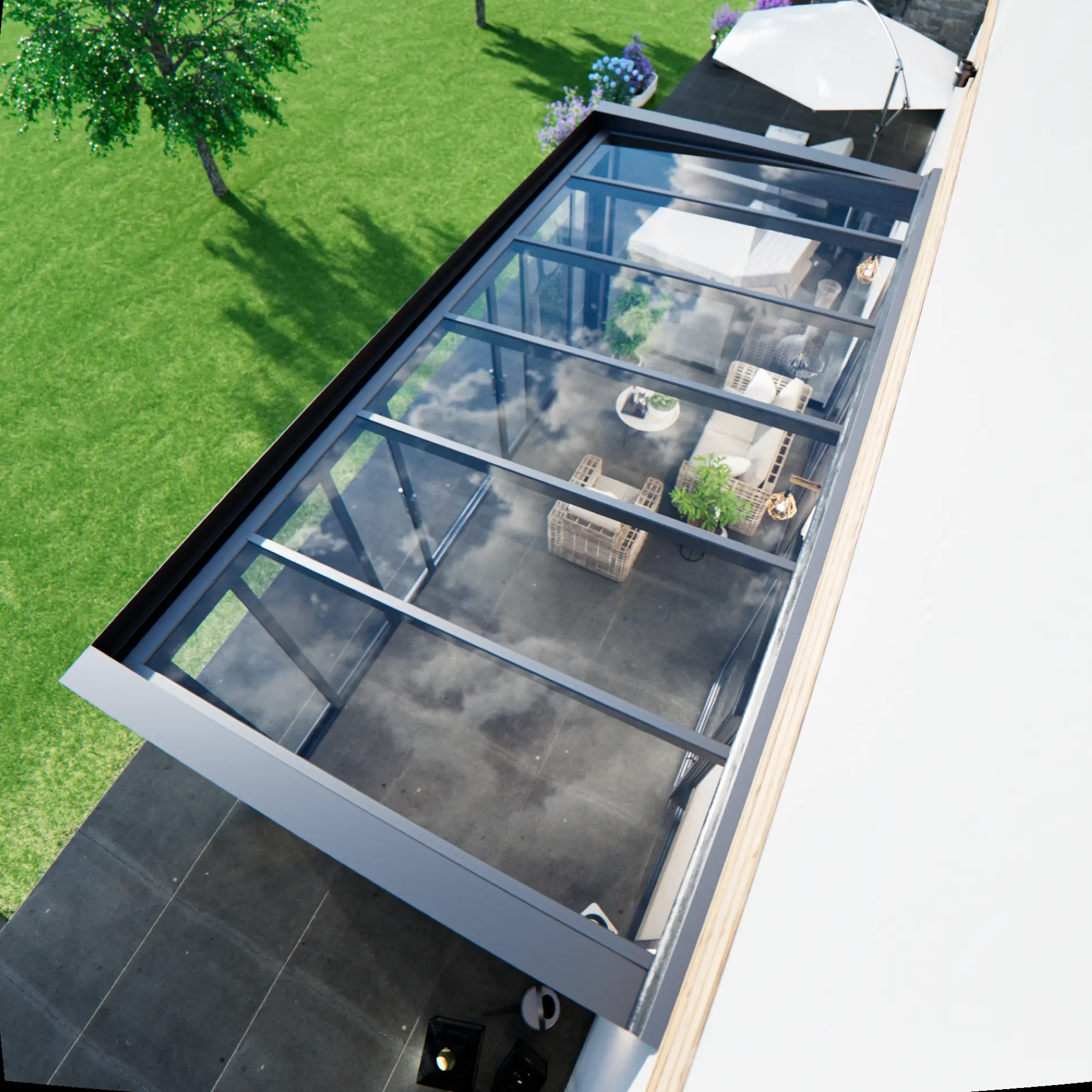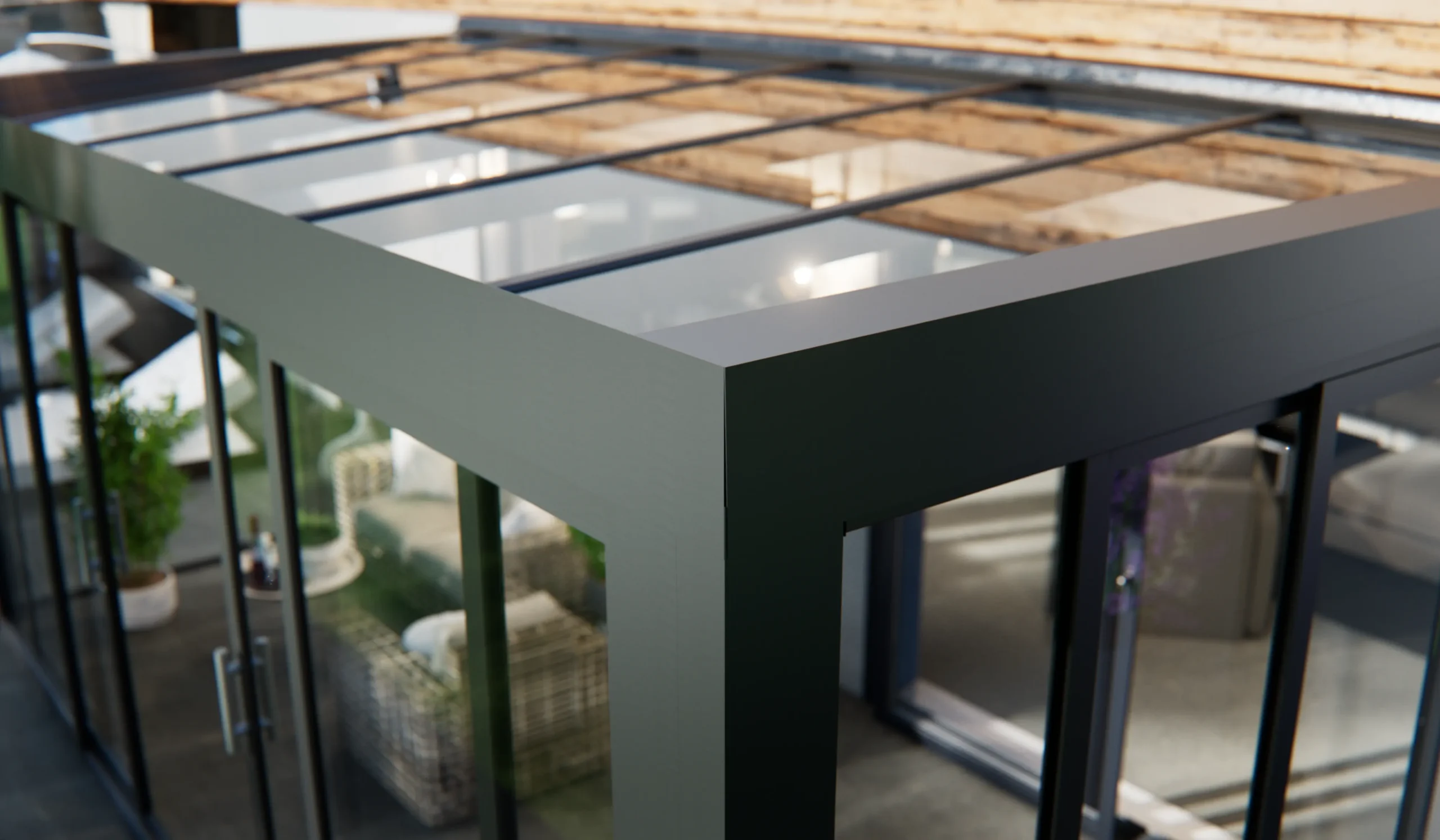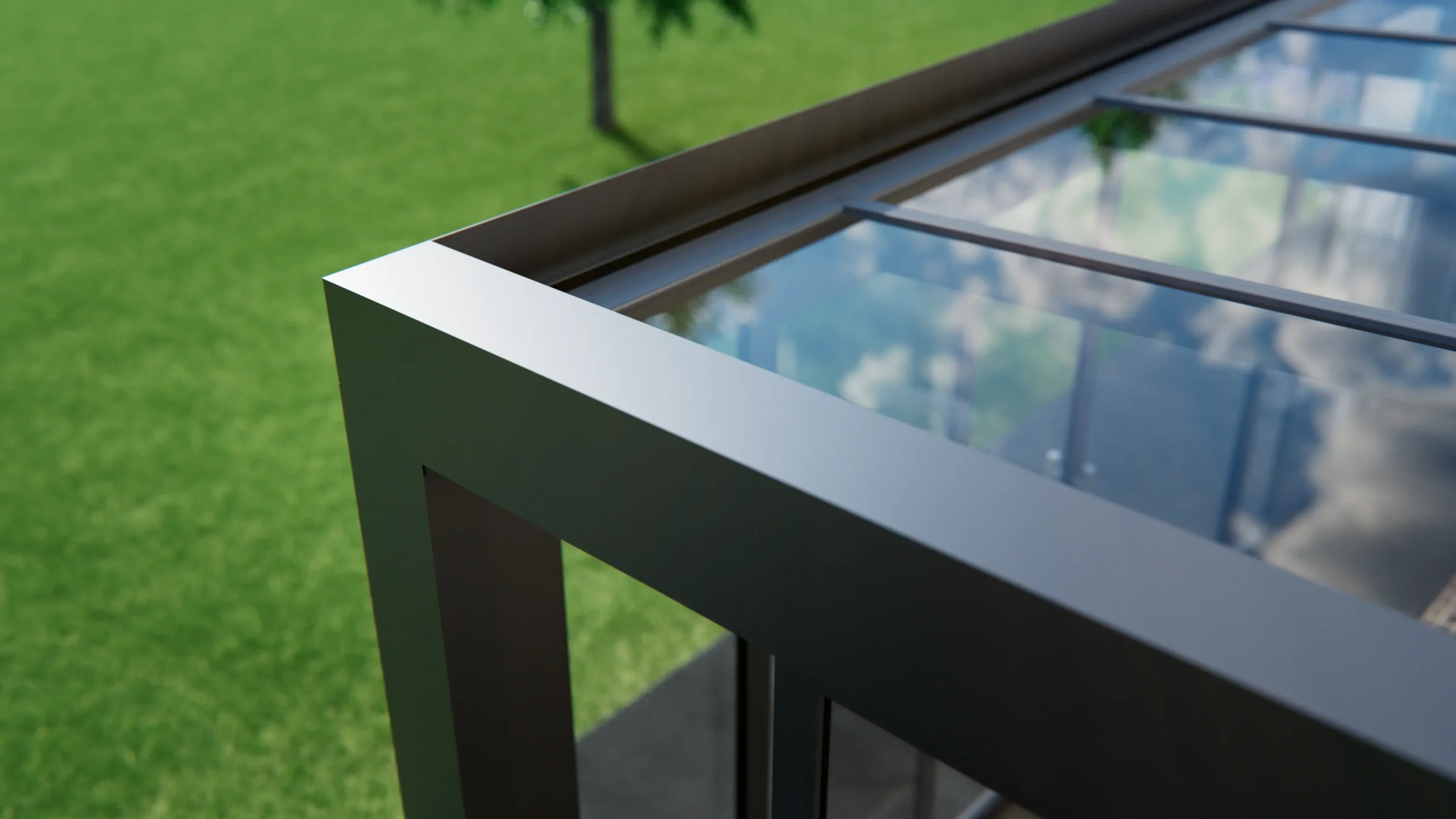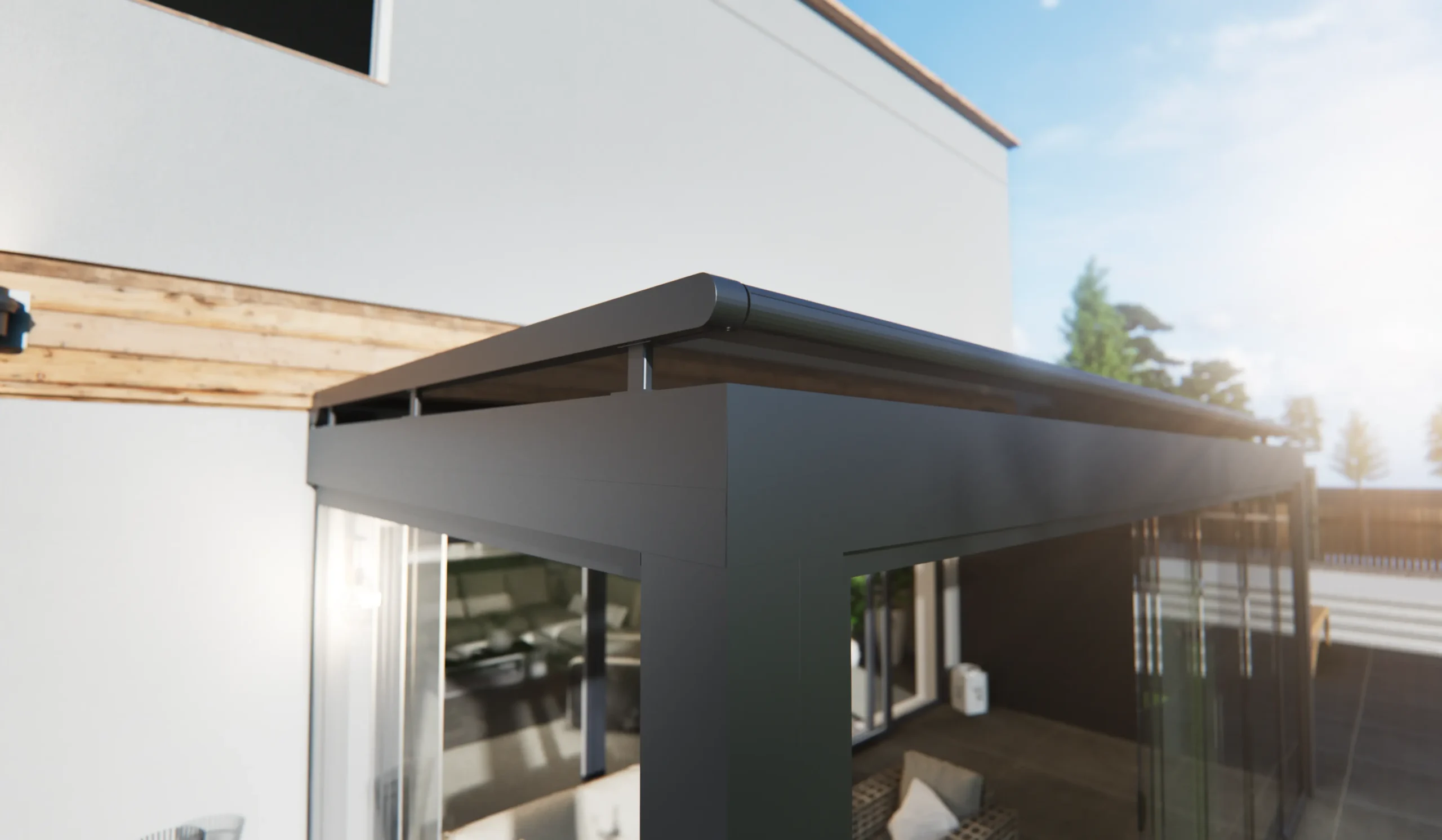 Die 80 Mikrometer dicke Pulverbeschichtung sorgt nicht nur für ein elegantes und modernes Aussehen, sondern bietet auch umfassenden Schutz vor jedem Wetter. Die quadratischen Pfosten von 200 x 250 Millimetern bieten eine robuste Basis. Die Cubo Line Veranda verfügt über eine 203 Millimeter breite Rinne und Träger von 55 x 122 Millimetern.